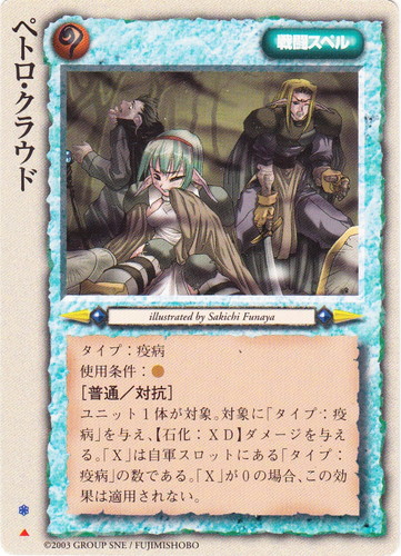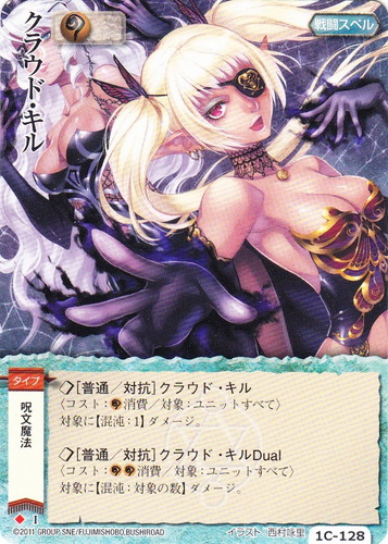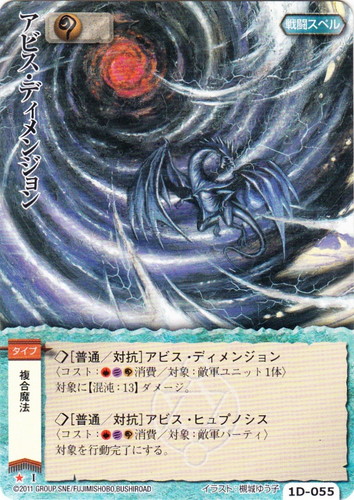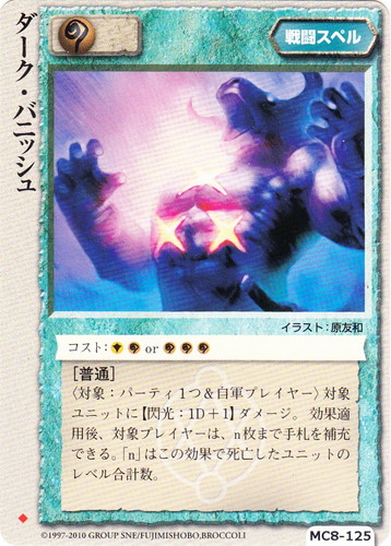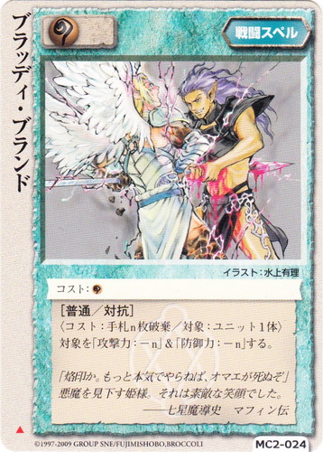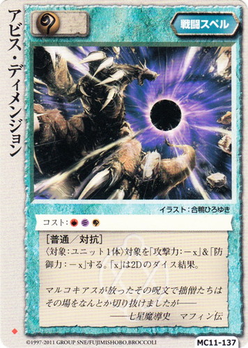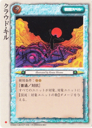 ![]() ![]() | カタストロフィ 戦闘スペル 魔道士の黙示録 ♣ 属性:魔 このカードは「スペル:火水土風聖魔魔」を使用することで効果を発揮する(複数のユニットで分担して使用してもよい)。 [普通] 対戦相手パーティのユニットすべてに効果。自分の残りの手札すべてを破棄することで、対象ユニットに【1D×1D】ダメージを与える。 illustrated by Izumi Takemoto |