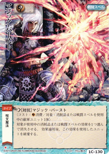 ![]() ![]() | LB-088U マジック・ミサイル 戦闘スペル 不滅なる聖騎士 ◆ 属性:聖 ブロック:LE 勢力:不滅なる聖騎士 タイプ:魔弾呪文/呪文魔法 ◇[普通/対抗]マジック・ミサイル 〈コスト:土または聖消費/対象:敵軍ユニット1体〉 対象に【閃光:1D】ダメージ。この戦闘スペルを使用したユニットが「種族:魔弾の射手」の場合、この効果を「ダメージ:+3」する。 「そんなもの――!撃ち落としてやる!」 ――ホーリィの手記 illustrated by 田口順子 |