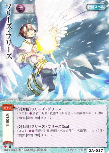 ![]() ![]() | ブリザード 戦闘スペル 魔道士の黙示録 ★ 属性:風 このカードは「スペル:水風」を使用することで効果を発揮する(複数のユニットで分担して使用してもよい)。 [普通] ユニットすべてに効果。対象ユニットが「イニシアチブ:±X」を持っている場合は【吹雪】によって死亡させ、持っていない場合は行動完了にする。 illustrated by Yuuji Kaida |