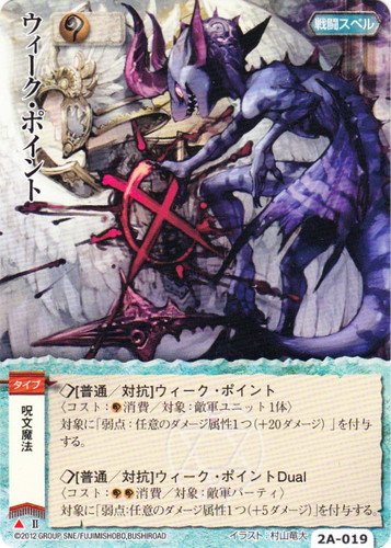 ![]() ![]() | M20A-140 ウィーク・ポイント 戦闘スペル 太陽の金の竜姫 ▲ 属性:魔 ブロック:AN 勢力:ALL タイプ:下級魔法/呪文魔法 ◇[普通/対抗]【Battle】 〈コスト:魔/対象:敵軍ユニット1体〉 対象に「弱点:ALL(6増)」を付与する。または対象に【混沌:2】ダメージ。 「巨人の弱点は踵だ。アキレス腱を切れば、勝手に腰を下げてくれる。そうなれば、後は存分に斬り込めばいい」 ――シルクの手記 illustrated by 田中としひさ |