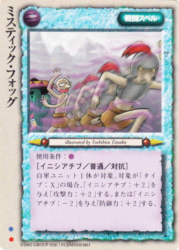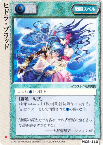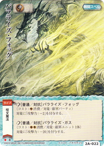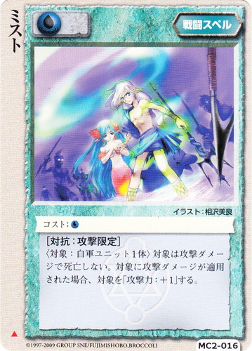![]() ![]() | フォッグ 戦闘スペル 魔道士の黙示録 ◆ 属性:水 このカードは「スペル:水水」を使用することで効果を発揮する(複数のユニットで分担して使用してもよい)。 [対抗:攻撃限定] ユニット1体に効果。対象ユニットは「攻撃」のダメージでは死亡しなくなる。 illustrated by Mila Aizawa |