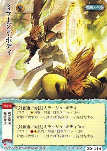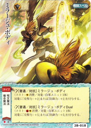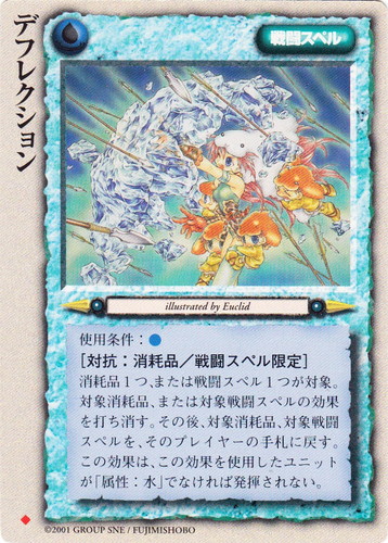 ![]() ![]() | ミラー・イメージ 戦闘スペル モンスター・コレクション ◆ 属性:水 [普通/対抗] ユニット1体に効果。対象ユニットは、「特殊能力/戦闘スペル/アイテム」の効果の対象にならなくなる。 illustrated by Jun-ichi Fujikawa |