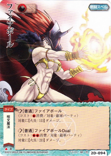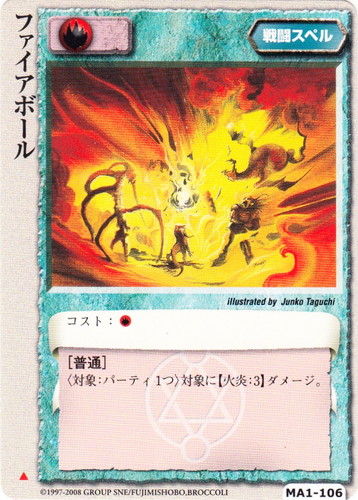 ![]() ![]() | ファイアボール 戦闘スペル モンスター・コレクション ▲ 属性:火 [普通] パーティ1つのすべてのユニットに、【火炎:3】ダメージを与える。 illustrated by Junko Taguchi |