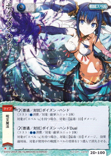 ![]() ![]() | M20A-116 ウォーター・ハンマー 戦闘スペル 太陽の金の竜姫 ◆ 属性:水 ブロック:AN 勢力:ALL タイプ:上級魔法/呪文魔法 ◇[普通]【Battle】 〈コスト:水/対象:敵軍ユニットすべて〉 対象に【津波:1D】ダメージ。効果適用後、対象を行動完了にする。 ◇[普通]Dual【Battle】 〈コスト:水水/対象:敵軍ユニットすべて〉 対象に【津波:2D】ダメージ。効果適用後、対象を行動完了にする。 illustrated by 若菜等+Ki |