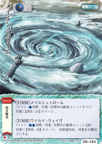 ![]() ![]() | メイルシュトローム 戦闘スペル モンスター・コレクション ★ 属性:水 [対抗:攻撃限定] 「攻撃」してきたすべてのユニットに、【津波:2Dして1番低い目】ダメージを与える。 illustrated by Rika Suzuki |