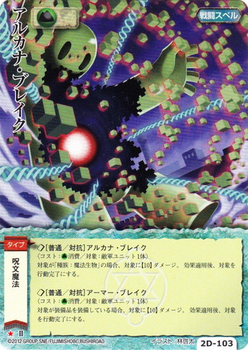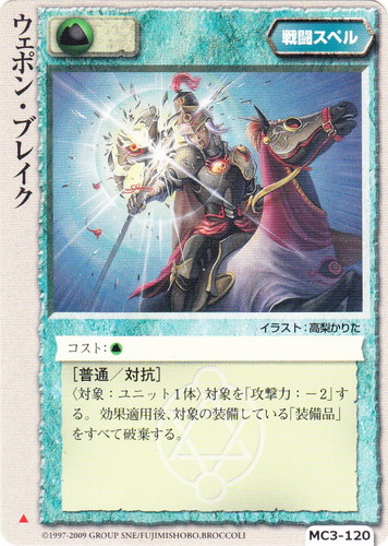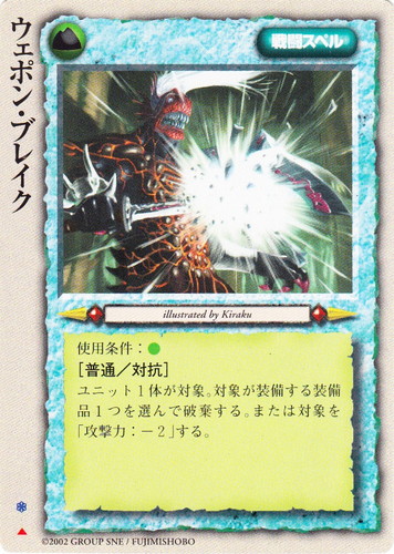 ![]() ![]() | M20A-P11 ウェポン・ブレイク 戦闘スペル プロモーションカード(20th Anniversary) ▲ 属性:土 ブロック:AN 勢力:ALL タイプ:下級魔法/呪文魔法 ◇[普通/対抗]【Battle】 〈コスト:土/対象:敵軍ユニット1体〉 対象に「攻撃力:-6」を付与する。または対象が装備中のアイテム1つを破棄する。 「逃げようミルク!怒った姉貴はやばい!今度は武器を破壊されるくらいじゃすまねえ!」 ――ミルクの手記 illustrated by 輝楽 |