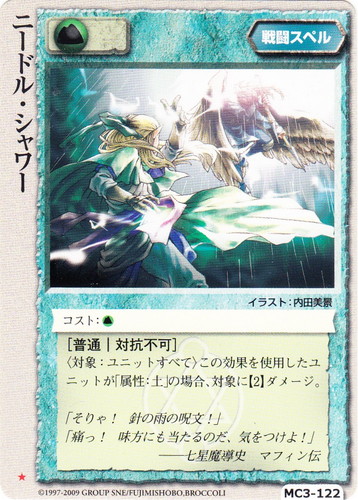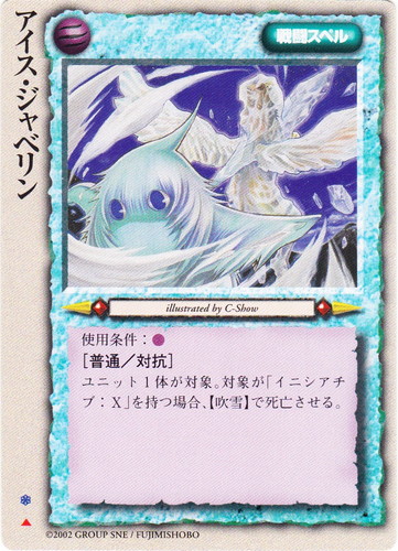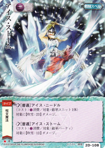 ![]() ![]() | アイス・ストーム 戦闘スペル モンスター・コレクション ◆ 属性:風 [普通] パーティ1つの「イニシアチブ:±X」をもっているユニットすべてを、【吹雪】によって死亡させる。 illustrated by Yuuya Kobayashi |
