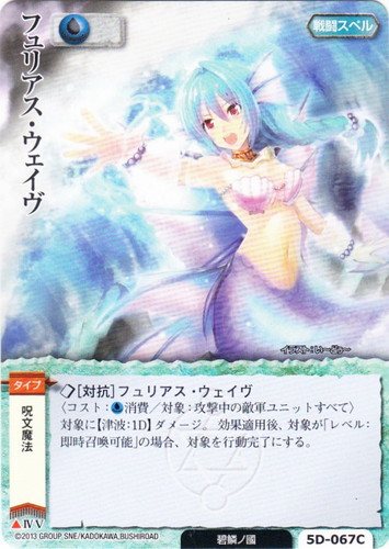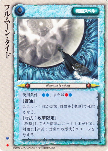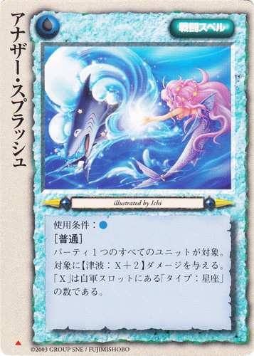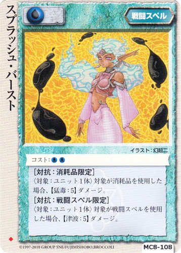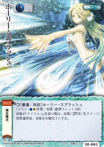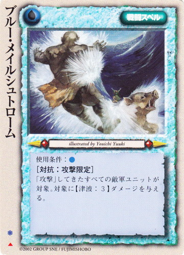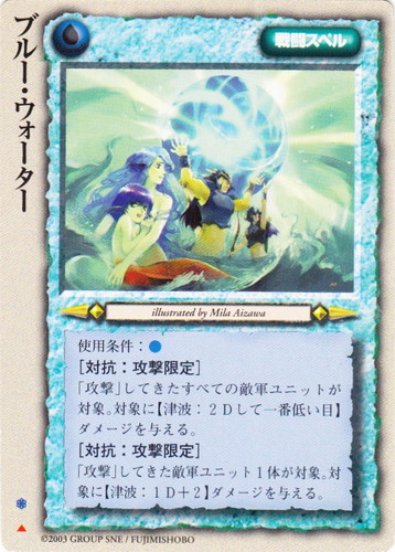 ![]() ![]() | ブルー・スプラッシュ 戦闘スペル 魔道士の黙示録 ★ 属性:水 このカードは「スペル:水水」を使用することで効果を発揮する(複数のユニットで分担して使用してもよい)。 [対抗:攻撃限定] 「攻撃」してきた対戦相手ユニットすべてに【津波:1D】ダメージを与える。 illustrated by Yuuko Tsukishiro |