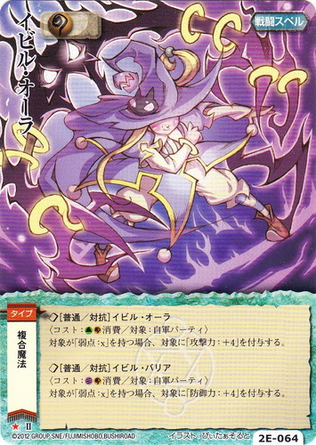 ![]() ![]() | M20A-139 イビル・デッド 戦闘スペル 太陽の金の竜姫 ◆ 属性:魔 ブロック:AN 勢力:ALL タイプ:禁忌魔法/呪文魔法 ◇[普通/対抗]【Battle】 〈コスト:魔魔/対象:敵軍ユニット1体〉 対象に【精神:2D】ダメージ。効果適用後、対象を行動完了にする。 「やって、アスモデウス!あんなヤツ、死ねばいい!」 剣の侯爵の作り出した暗黒が、あいつに襲いかかる。 ――ミルクの手記 illustrated by 幻超二 |