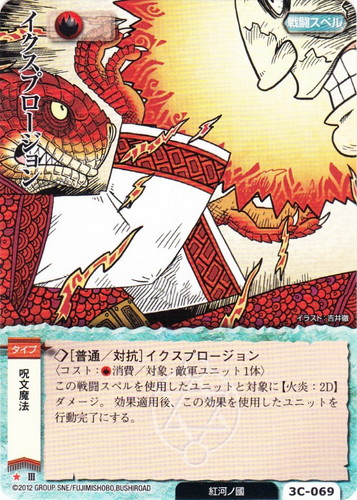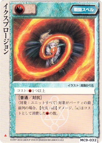 ![]() ![]() | イクスプロージョン 戦闘スペル 古代帝国の遺産 ◆ 属性:火 [普通] すべてのパーティの最前列のユニットに効果。対象ユニットに【火炎:1D×1D】ダメージを与える。 illustrated by Karita Takanashi |