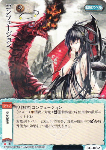 ![]() ![]() | コンフュージョン 戦闘スペル 古代帝国の遺産 ▲ 属性:魔 [普通] パーティ1つの「アイテム:X」をもつユニットすべてを、そのプレイヤーの手札に戻す。 illustrated by Izumi Takemoto |