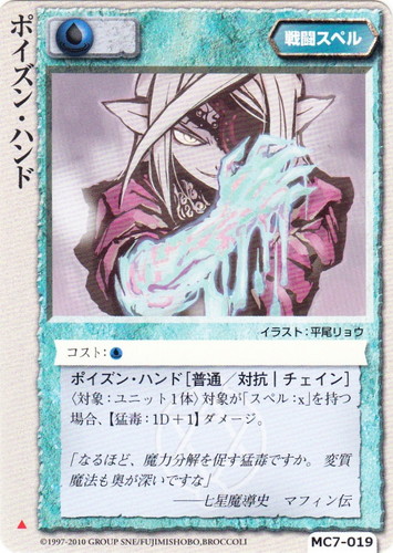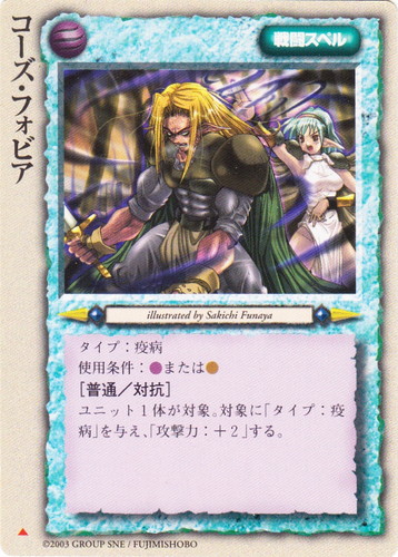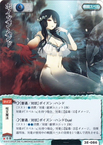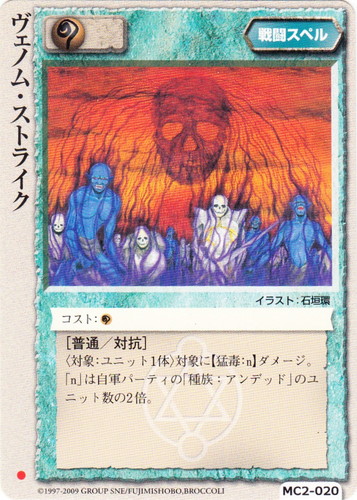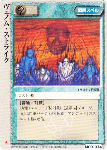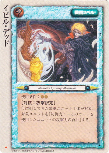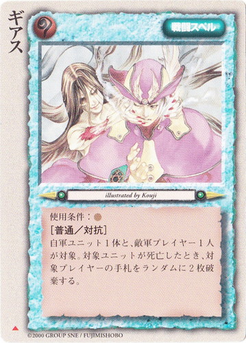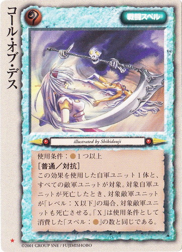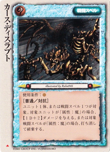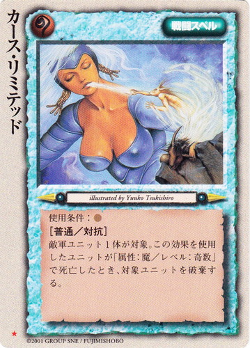 ![]() ![]() | カース 戦闘スペル モンスター・コレクション ◆ 属性:魔 [対抗:死亡限定] 自軍パーティの「属性:魔」ユニットが死亡したとき、対戦相手の対象ユニット1体を指定して、同時に破棄する。 illustrated by Hiroki Haritama |