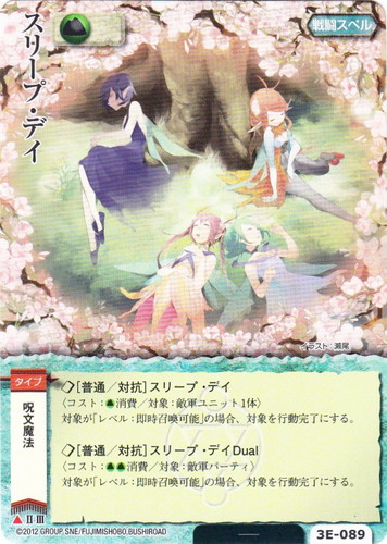 ![]() ![]() | M20E-055 スリープ 戦闘スペル モンスター・コレクションDeus ● 属性:土 種族:秘伝魔法/呪文魔法 ブロック:DE 勢力:アラシャ [速攻]【Battle】 速攻タイミングに使用可能 コスト:土土または(*)土 対象:ユニット1体 行動完了にする。 illustrated by 田口順子 |