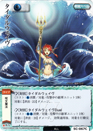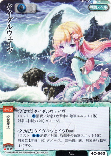 ![]() ![]() | M20A-117 タイダルウェイヴ 戦闘スペル 太陽の金の竜姫 ◆ 属性:水 ブロック:AN 勢力:ALL タイプ:禁忌魔法/呪文魔法 ◇[対抗]【Battle】 〈コスト:水水/対象:攻撃中の敵軍ユニット1体〉 対象に【津波:20】ダメージ。効果適用後、対象を行動完了にする。 「さすがは魔海神だ。エカテリーナを怒涛で倒すなんて」 ――シルクの手記 illustrated by 鈴木理華 |
