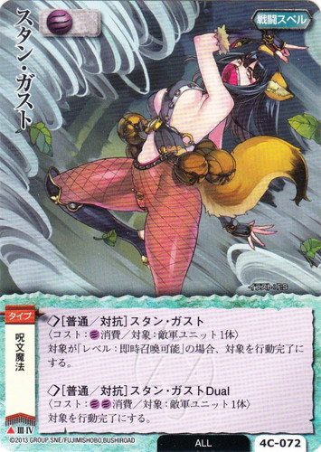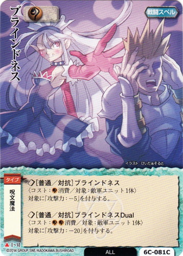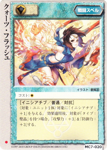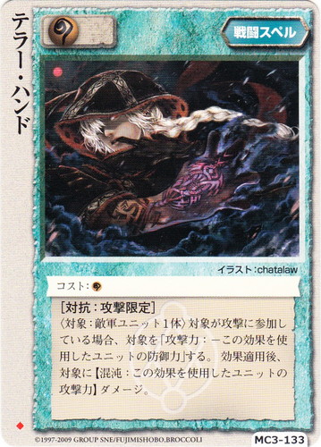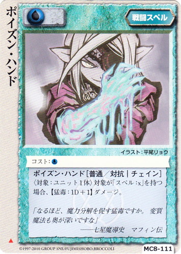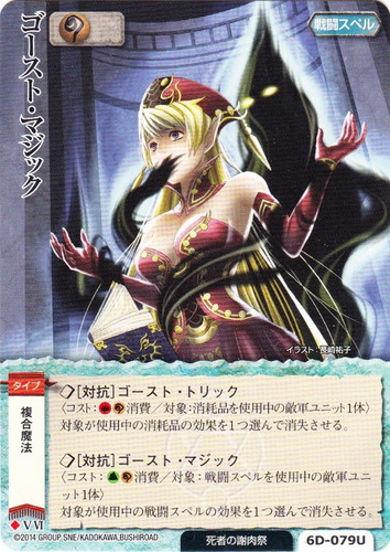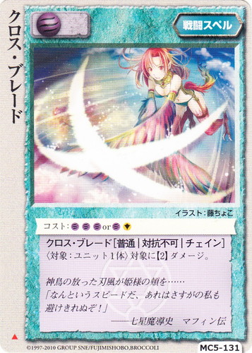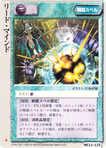 ![]() ![]() | ターゲット 戦闘スペル 魔道士の黙示録 ◆ 属性:風 [対抗:戦闘スペル限定] このカードは[対抗]で使用された戦闘スペルに対しては使用できない。 戦闘スペル1つに効果。その戦闘スペルの対象が「ユニット1体」の場合「ユニット2体」に変更する。増えたぶんの対象は、このカードを使用したプレイヤーが指定する。 illustrated by Yuuji Kaida |
