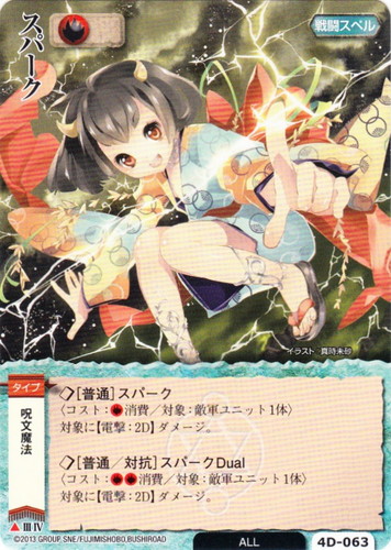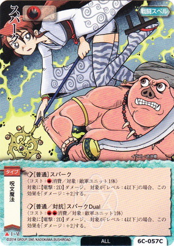 ![]() ![]() | M20A-111 ティンダー・ストライク 戦闘スペル 太陽の金の竜姫 ▲ 属性:火 ブロック:AN 勢力:ALL タイプ:上級魔法/呪文魔法 ◇[普通/対抗]【Battle】 〈コスト:火/対象:敵軍ユニット1体〉 対象に【火炎:1D】ダメージ。対象が「アイテム:x」を持つ場合、このダメージを「+2」する。 ◇[普通/対抗]Dual【Battle】 〈コスト:火火/対象:敵軍ユニット1体〉 対象が「アイテム:x」を持つ場合、対象に【火炎:2D+5】ダメージ。 illustrated by 相崎勝美 |