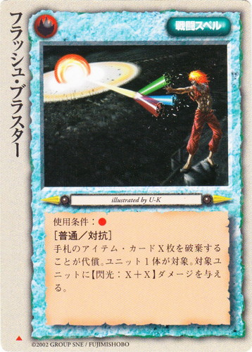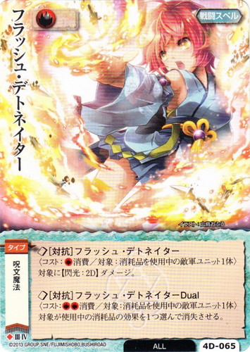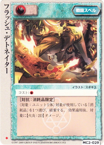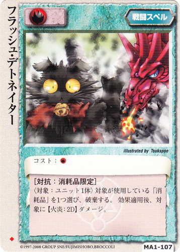 ![]() ![]() | フラッシュ・デトネイター 戦闘スペル モンスター・コレクション ◆ 属性:火 [対抗:アイテム(消耗品)限定] 「アイテム(消耗品)」1つの効果を打ち消し、同時にそれを使用したユニットに【火炎:2D】ダメージを与える。 illustrated by C-Show |