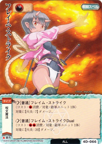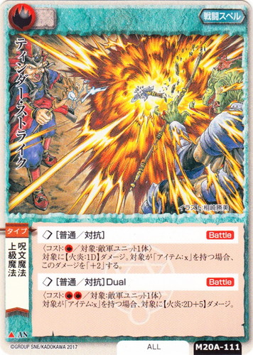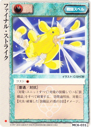 ![]() ![]() | ファイナル・ストライク 戦闘スペル モンスター・コレクション ★ 属性:火 [普通/対抗] すべての「アイテム(装備品)」とすべてのユニットに効果。対象の「アイテム(装備品)」を破棄し、その後対象のユニットに【火炎:〈破棄された「装備品」の数〉D】ダメージを与える。 illustrated by C-Show |