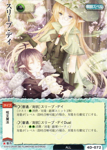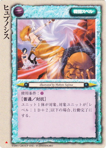 ![]() ![]() | スリープ 戦闘スペル モンスター・コレクション ◆ 属性:土 [普通/対抗] 「レベル:〈1D+1〉以下」のユニット1体を、行動完了にする。 illustrated by Junko Taguchi |