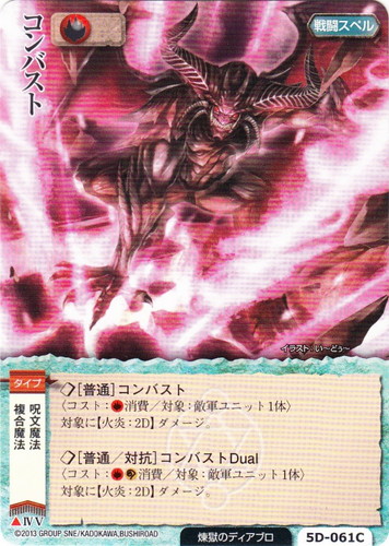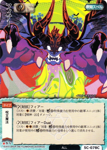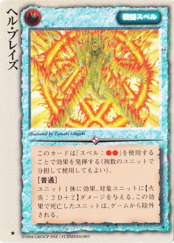 ![]() ![]() | ヘル・ブレイズ 戦闘スペル 魔道士の黙示録 ★ 属性:火 このカードは「スペル:火火」を使用することで効果を発揮する(複数のユニットで分担して使用してもよい)。 [普通] ユニット1体に効果。対象ユニットに【火炎:2D+2】ダメージを与える。この効果で死亡したユニットは、ゲームから除外される。 illustrated by Tamaki Ishigaki |