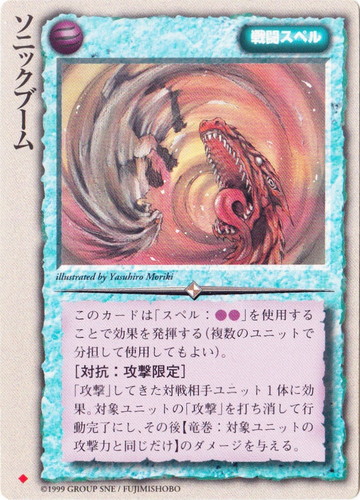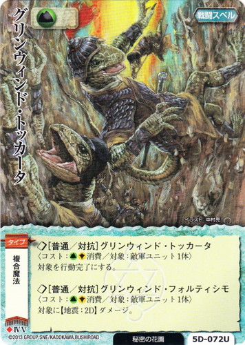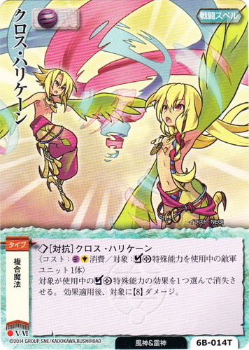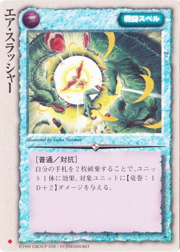 ![]() ![]() | M20A-127 ウィンド・カッター 戦闘スペル 太陽の金の竜姫 ▲ 属性:風 ブロック:AN 勢力:ALL タイプ:上級魔法/呪文魔法 ◇[普通/対抗]【Battle】 〈コスト:風/対象:敵軍ユニット1体〉 対象に【竜巻:1D】ダメージ。対象が「進軍タイプ:飛行」の場合、このダメージを「+2」する。 ◇[普通/対抗]Dual【Battle】 〈コスト:風風/対象:敵軍ユニット1体〉 「進軍タイプ:飛行」の対象に「竜巻:2D+5】ダメージ。 illustrated by 開田裕治 |