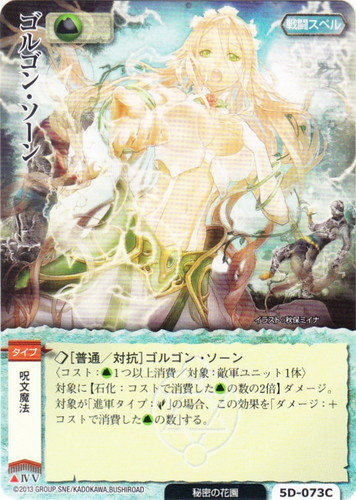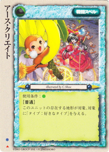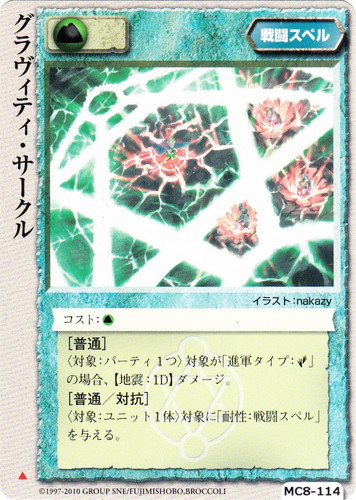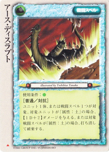 ![]() ![]() | アース・サークル 戦闘スペル モンスター・コレクション ★ 属性:土 [普通/対抗] ユニット1体を「属性:土」に変更する。対象ユニットがもとから「属性:土」ユニットの場合、「攻撃力:×2」する。 illustrated by Jun-ichi Fujikawa |