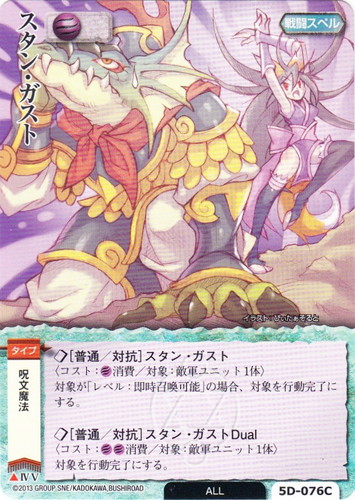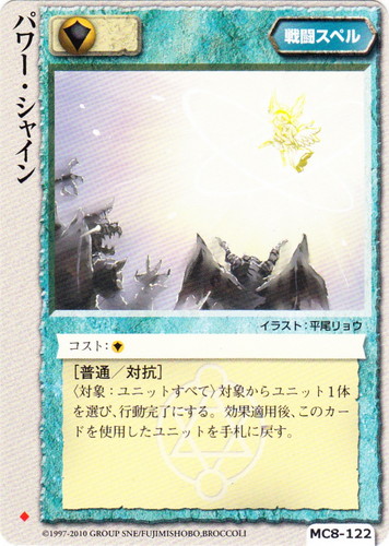 ![]() ![]() | スペクトル 戦闘スペル 魔道士の黙示録 ▲ 属性:聖 [普通] パーティ1つのユニットすべてに効果。対象ユニットが未使用の「スペル:X」を持っていた場合、それをすべて「スペル:*」に変更する。 illustrated by Kairi Yura |