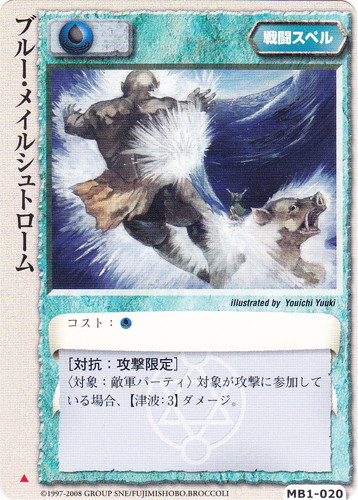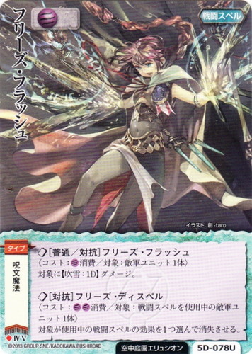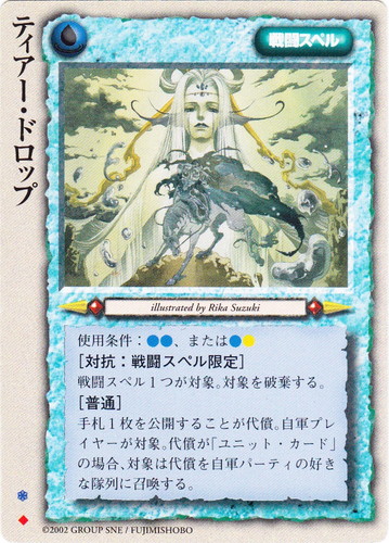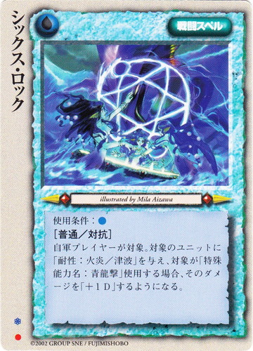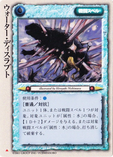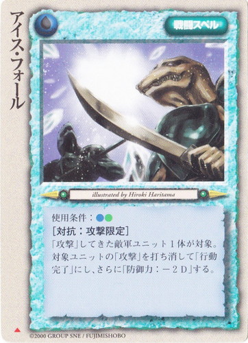 ![]() ![]() | フリーズ・ブラッド 戦闘スペル 魔道士の黙示録 ◆ 属性:水 [普通/対抗] ユニット1体に効果。対象ユニットが「属性:水」の場合、【1D】ダメージを与える。 「わーい、今夜はお刺身ですぅ」 エコーの呪文によって、凍りづけになったフライング・エストック。リーフ大歓喜。 ――ホーリィの手記 illustrated by Suika Natsuno |