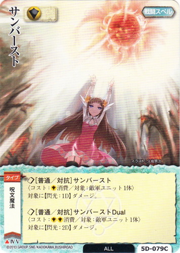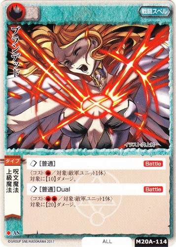 ![]() ![]() | M20A-114 ブランデッド 戦闘スペル 太陽の金の竜姫 ◆ 属性:火 ブロック:AN 勢力:ALL タイプ:上級魔法/呪文魔法 ◇[普通]【Battle】 〈コスト:火/対象:敵軍ユニット1体〉 対象に【10】ダメージ。 ◇[普通]Dual【Battle】 〈コスト:火火/対象:敵軍ユニット1体〉 対象に【20】ダメージ。 illustrated by 井上純一 |