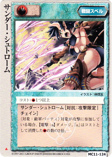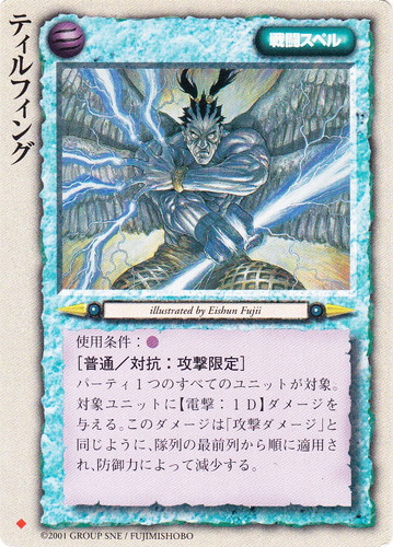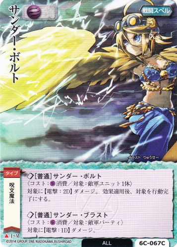 ![]() ![]() | M20A-131 ティルフィング 戦闘スペル 太陽の金の竜姫 ▲ 属性:風 ブロック:AN 勢力:ALL タイプ:下級魔法/呪文魔法 ◇[普通/対抗]【Battle】 〈コスト:風/対象:敵軍ユニット1体〉 対象に【電撃:1D】ダメージ。対象が「スペル:x」を持つ場合、このダメージを「+2」する。 「ブリオさんの、ばかー!」 取り乱した私の声に反応して、稲妻が巻き起こりました。 ――シルクの手記 illustrated by 藤井英俊 |