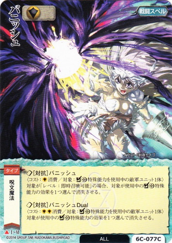 ![]() ![]() | M20A-135 ディスペル・マジック 戦闘スペル 太陽の金の竜姫 ▲ 属性:聖 ブロック:AN 勢力:ALL タイプ:上級魔法/呪文魔法 ◇[対抗]【Battle】 〈コスト:聖/対象:戦闘スペルを使用中の敵軍ユニット1体〉 「レベル:即時召喚可能」の対象が使用中の戦闘スペル1つをキャンセルする。 ◇[対抗]Dual【Battle】 〈コスト:聖聖/対象:戦闘スペルを使用中の敵軍ユニット1体〉 対象が使用中の戦闘スペル1つをキャンセルする。 illustrated by こいでたく |
