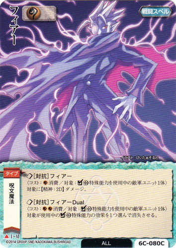 ![]() ![]() | M20A-143 フィアー 戦闘スペル 太陽の金の竜姫 ◆ 属性:魔 ブロック:AN 勢力:ALL タイプ:上級魔法/呪文魔法 ◇[対抗]【Battle】 〈コスト:魔/対象:敵軍ユニット1体〉 [普通/対抗]で特殊能力を使用中の対象に【精神:2D】ダメージ。 ◇[対抗]Dual【Battle】 〈コスト:魔魔/対象:自軍ユニット1体〉 対象が[普通/対抗]で使用中の特殊能力1つをキャンセルする。 illustrated by 中村哲也 |