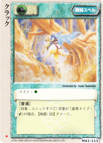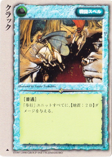![]() ![]() | クラック 戦闘スペル モンスター・コレクション ▲ 属性:土 [普通] 「歩行」ユニットすべてに、【地震:2D】ダメージを与える。 illustrated by Yuuko Tsukishiro |
