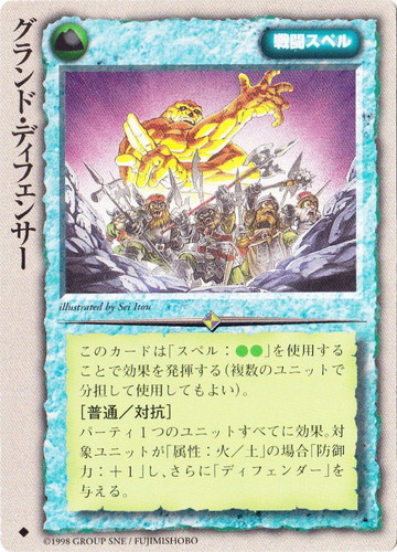 ![]() ![]() | グランド・ディフェンサー 戦闘スペル 魔道士の黙示録 ◆ 属性:土 このカードは「スペル:土土」を使用することで効果を発揮する(複数のユニットで分担して使用してもよい)。 [普通/対抗] パーティ1つのユニットすべてに効果。対象ユニットが「属性:火/土」の場合「防御力:+1」し、さらに「ディフェンダー」を与える。 illustrated by Sei Itou |