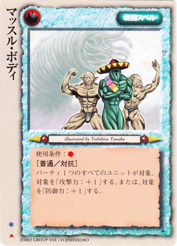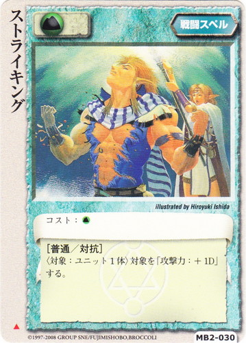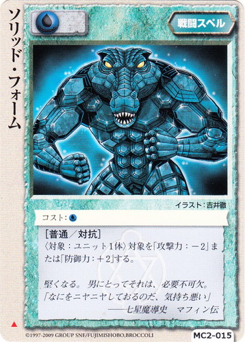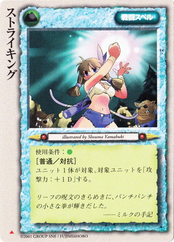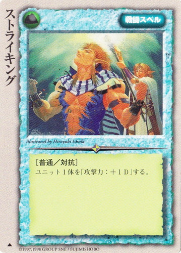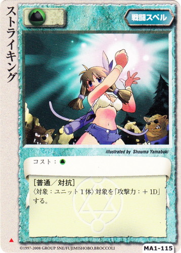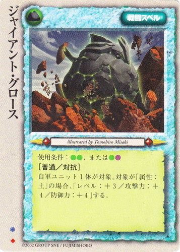 ![]() ![]() | ストライキング 戦闘スペル モンスター・コレクション ▲ 属性:土 [普通/対抗] ユニット1体を「防御力:+1D」する。 illustrated by Hiroyuki Ishida |