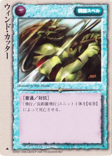 ![]() ![]() | ウィンド・カッター 戦闘スペル モンスター・コレクション ▲ 属性:風 [普通/対抗] 「飛行/長距離飛行」ユニット1体を【竜巻】によって死亡させる。 illustrated by Mila Aizawa |