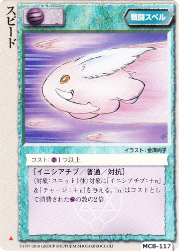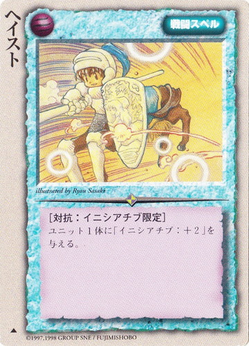 ![]() ![]() | ヘイスト 戦闘スペル モンスター・コレクション ▲ 属性:風 [対抗:イニシアチブ限定] ユニット1体に「イニシアチブ:+2」を与える。 illustrated by Ryou Sasaki |