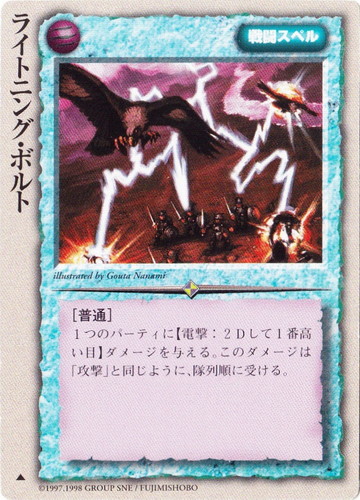 ![]() ![]() | ライトニング・ボルト 戦闘スペル モンスター・コレクション ▲ 属性:風 [普通] パーティ1つに【電撃:2Dして1番高い目】ダメージを与える。このダメージは「攻撃」と同じように、隊列順に受ける。 illustrated by Gouta Nanami |
