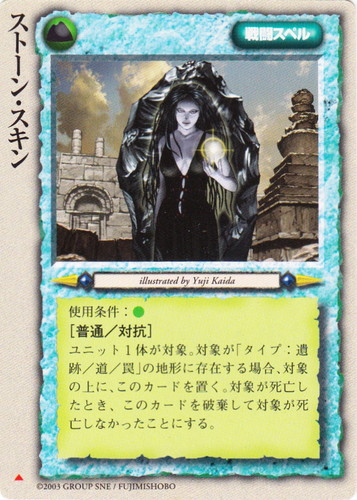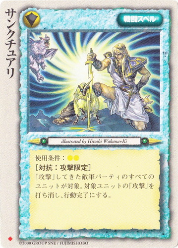 ![]() ![]() | レジスト 戦闘スペル 魔道士の黙示録 ▲ 属性:土 [普通/対抗] パーティ1つのユニットすべてに効果。対象ユニットは「アイテム/戦闘スペル/特殊能力」の効果では死亡しなくなる。 illustrated by Masahisa Suzuki |