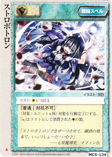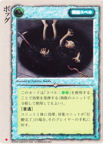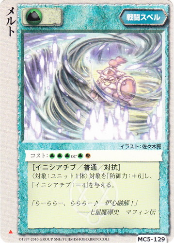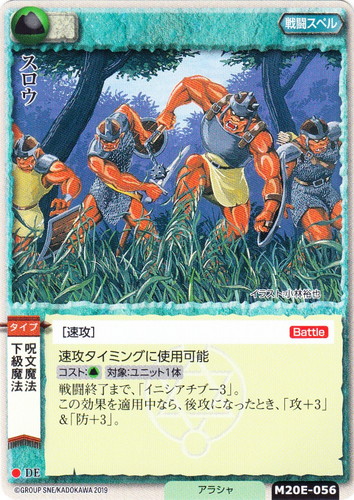 ![]() ![]() | スロウ 戦闘スペル モンスター・コレクション ▲ 属性:土 [対抗:イニシアチブ限定] ユニット1体に「イニシアチブ:-2」を与える。 illustrated by Yuuya Kobayashi |
