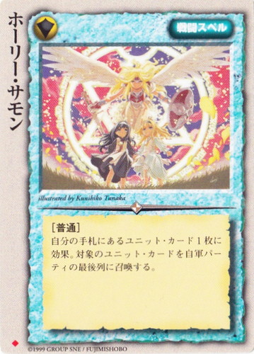 ![]() ![]() | ホーリー・サークル 戦闘スペル モンスター・コレクション ★ 属性:聖 [普通/対抗] ユニット1体を「属性:聖」に変更する。対象ユニットがもとから「属性:聖」の場合、「攻撃力」を「レベル」と同じ値に変更する。 illustrated by Jun-ichi Fujikawa |