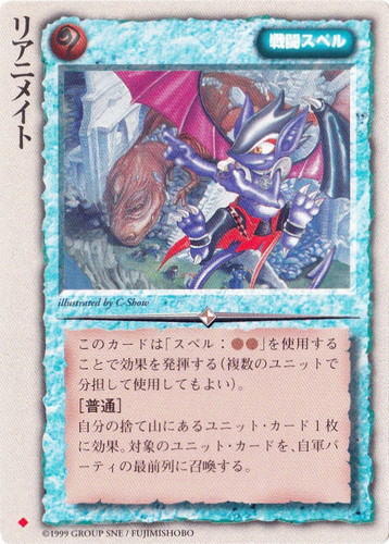 ![]() ![]() | リコール・スピリット 戦闘スペル 魔道士の黙示録 ★ 属性:聖 このカードは「スペル:火土聖」を使用することで効果を発揮する(複数のユニットで分担して使用してもよい)。 [対抗:死亡限定] 死亡したユニット1体を死亡しなかったことにし、さらに自分の捨て山からユニット・カード1枚を選んで、すべてのプレイヤーに見せてから自分の手札に加える。 illustrated by Toshihisa Tanaka |