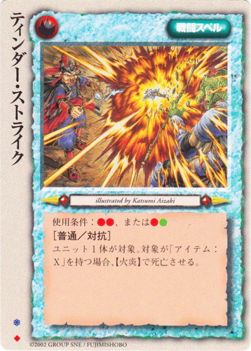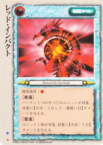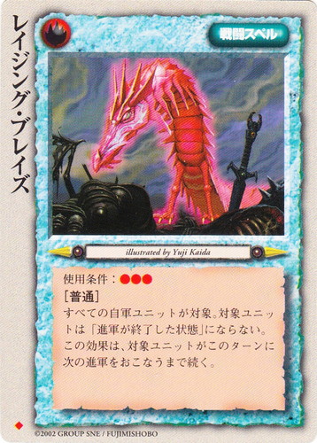 ![]() ![]() | バーサーク 戦闘スペル 古代帝国の遺産 ▲ 属性:火 [普通/対抗] ユニット1体に効果。対象ユニットが「属性:火/風」の場合「攻撃力:×2」し、同時に「防御力:1」に変更する。 illustrated by Ryou Nakamura |
