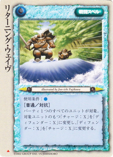 ![]() ![]() | リターニング・ウェイヴ 戦闘スペル モンスター・コレクション ★ 属性:水 [普通/対抗] パーティ1つの「チャージ」もしくは「ディフェンダー」をもっているすべてのユニットに効果。対象ユニットを「チャージ→ディフェンダー」に、「ディフェンダー→チャージ」に変更する。 illustrated by Yuuya Kobayashi |