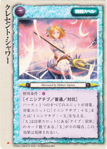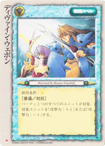 ![]() ![]() | ウォーター・サークル 戦闘スペル モンスター・コレクション ★ 属性:水 [普通/対抗] ユニット1体を「属性:水」に変更する。対象ユニットがもとから「属性:水」の場合、「攻撃力:+1D」する。 illustrated by Jun-ichi Fujikawa |