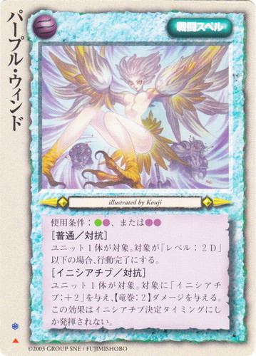 ![]() ![]() | サプライズ・ウィンド 戦闘スペル 古代帝国の遺産 ★ 属性:風 [対抗:イニシアチブ限定] ユニット1体に【竜巻:2】ダメージを与え、同時に「イニシアチブ:+1」を与える。 illustrated by Suika Natsuno |