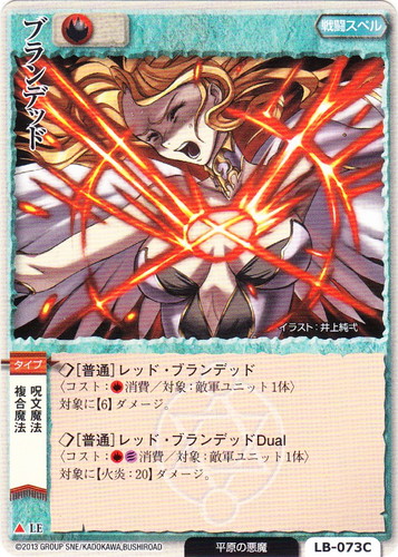 ![]() ![]() | LB-091U デス・シンフォニー 戦闘スペル 不滅なる聖騎士 ◆ 属性:魔 ブロック:LE 勢力:平原の悪魔 タイプ:複合魔法 ◇[普通]デス・シンフォニー 〈コスト:火魔消費/対象:敵軍パーティ〉 対象に【火炎:この戦闘スペルを使用したユニットの合計レベル】ダメージ。 ◇[対抗]デス・レクイエム 〈コスト:風魔消費/対象:攻撃中の敵軍ユニットすべて〉 対象に【混沌:この戦闘スペルを使用したユニットの合計レベル】ダメージ。 illustrated by 帆場瑛明 |