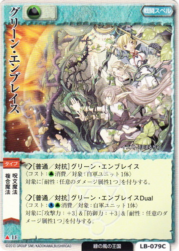 ![]() ![]() | プラント・ウォール 戦闘スペル 古代帝国の遺産 ◆ 属性:土 [対抗:イニシアチブ限定] このカードを「属性:土/ユニット名:植物の壁/種族:プラント/レベル:1/攻撃力:0/防御力:4/進軍タイプ:歩行/イニシアチブ:-1」のユニットとして、パーティの最前列に召喚する。こうして召喚されたユニットは「戦闘スペル」ではなくなり、戦闘終了タイミングに破棄される。このユニットは同時攻撃タイミングには破棄される。 illustrated by Shikidouji |