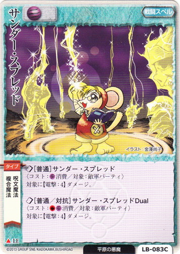 ![]() ![]() | LB-085C リヴァース・ライトニング 戦闘スペル 不滅なる聖騎士 ▲ 属性:風 ブロック:LE 勢力:風神&雷神 タイプ:呪文魔法 ◇[普通/対抗]リヴァース・ライトニング 〈コスト:風消費/対象:敵軍ユニット1体〉 対象に【電撃:1D】ダメージ。 ◇[普通/対抗]リヴァース・ライトニングDual 〈コスト:風風消費/対象:敵軍ユニット1体〉 対象に【電撃:1D】ダメージ。効果適用後、対象を行動完了にする。 illustrated by 七水剛多 |