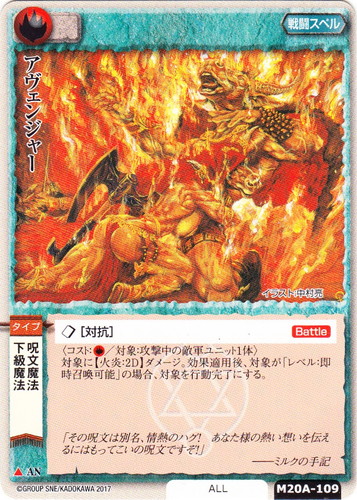 ![]() ![]() | M20A-109 アヴェンジャー 戦闘スペル 太陽の金の竜姫 ▲ 属性:火 ブロック:AN 勢力:ALL タイプ:下級魔法/呪文魔法 ◇[対抗]【Battle】 〈コスト:火/対象:攻撃中の敵軍ユニット1体〉 対象に【火炎:2D】ダメージ。効果適用後、対象が「レベル:即時召喚可能」の場合、対象を行動完了にする。 「その呪文は別名、情熱のハグ!あなた様の熱い想いを伝えるにはもってこいの呪文ですぞ!」 ――ミルクの手記 illustrated by 中村亮 |